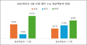 [충남일보 윤근호 기자] 9월 모평은 실제 수능과 가장 유사한 시험이기도 하지만, 수시 지원 전에 치르는 마지막 모의평가라는 점에서 의미가 크다. 9월 모평 성적을 토대로 정시 지원 가능 대학을 예상하고 수시 전략을 수립해야 하기 때문이다.그렇다면 9월 모평과 실제 수능은 비슷한 성적을 보일까? 진학닷컴 데이터를 통해 살펴본 결과, 절반 이상이 수능에서 9월 모평보다 낮은 점수를 받은 것으로 나타났다.▲ 작년 수능, 절반 이상은 9월 모평보다 평균백분위 하락진학닷컴 정시합격예측 서비스를 통해 2025학년도 9월 모평 성적과 수능 성