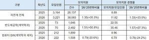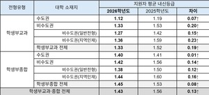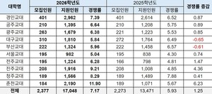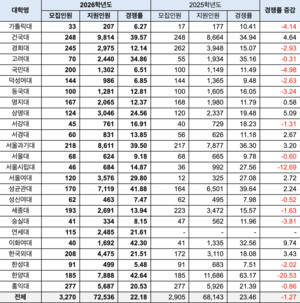 [충남일보 윤근호 기자] 지난해부터 확대된 무전공(자유전공) 선발이 2년차를 맞은 2026학년도 수시모집에서, 서울 소재 대학 무전공(유형1) 모집단위의 전체 경쟁률이 22.18 대 1로 나타났다. 전년도(23.46 대 1) 대비 1.27p 하락했으나 지원 인원은 7만2536명으로 전년(6만8143명)보다 4000명 이상 증가했다.경쟁률이 하락한 데에는 모집인원 확대가 주요 요인으로 작용했다. 지난해 2905명이었던 모집정원이 올해 3270명으로 늘어나면서 전체 경쟁률은 다소 낮아졌지만, 지원인원이 크게 증가한 것은 수험생들의 관심