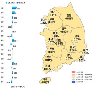 [충남일보 김현수 기자] 정부의 강력한 부동산 규제가 지속되는 가운데 세종 아파트 가격은 하락에서 보합으로 전환됐다.충청권 중 세종(-0.09%→0.00%)은 지역·단지별 혼조세를 보이며 지난주 크게 떨어진 하락폭을 만회했다. 이어 대전(-0.05%→-0.04%)과 충남(-0.03%→-0.02%)은 하락폭이 소폭 축소됐고 충북(-0.02%→-0.02%)은 하락세가 지속됐다.한국부동산원에 따르면 11월 1주 전국 아파트 매매가격은 지난주(0.07%) 대비 상승했다. 수도권(0.14%→0.13%) 및 서울(0.23%→0.19%)은 상승