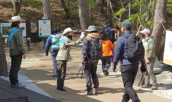 [충남일보 길상훈 기자] 국립공원공단 계룡산국립공원사무소는 25일과 26일 양일간 계룡산국립공원 동학사를 비롯해 갑사, 수통골 등 전역에서 직원 및 특별단속팀, 자원봉사자 등 120여 명이 참여한 가운데 마스크 및 손소독제 배포, 발열체크, 사회적 거리두기 운동, 2m탐방거리두기 등에 대한 대대적인 홍보에 집중하고 이에 탐방객들을 위주로 캠페인도 벌여나갔다. 이 행사는 오는 5월 5일까지 진행된다.