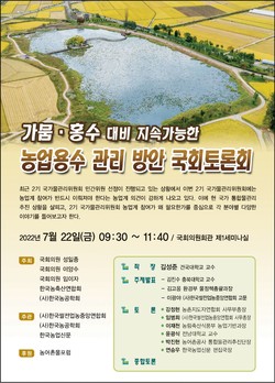 성일종 의원, 이양수 의원, 임이자 의원, 한국농축산연합회(회장 이은만)와 한국농공학회(회장 최경숙)가 공동으로 주최하고 농어촌물포럼이 후원하는 ‘가뭄, 홍수 등에 대비한 지속가능한 농업용수 관리 방안 마련을 위한 국회 토론회’는 (사)한국쌀전업농중앙연합회, (사)한국농공학회, 한국농업신문 공동 주관으로 국회 제1세미나실에서 개최될 예정이다.