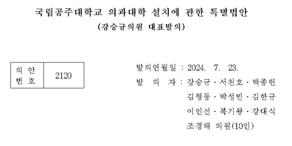 홍성‧예산을 지역구로 둔 국민의힘 강승규 의원도 지난달 ‘국립공주대학교 의과대학 설치에 관한 특별법안’을 대표발의하며 힘을 실었다.