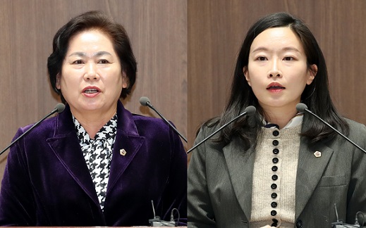 ○··· 충남도의회 소속 두 여성 의원이 4일 올해 첫 임시회에서 희소식을 전해 훈훈한 분위기가 연출.