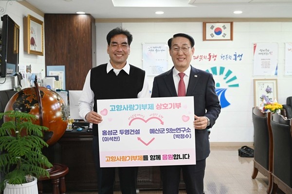 이에 따라 홍성 두영건설 이석찬 대표와 예산 '잇는연구소' 박정수 대표는 지난 7일 고향사랑기부금 100만 원을 동시에 전달하며 상대 지자체를 응원.