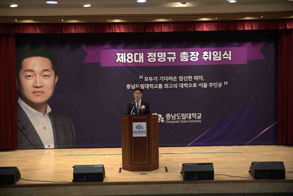 ▲ 충남도립대학교 설립 이후 최연소 총장인 제8대 정명규 총장(47)이 10일 취임식을 갖고 공식 업무에 돌입.