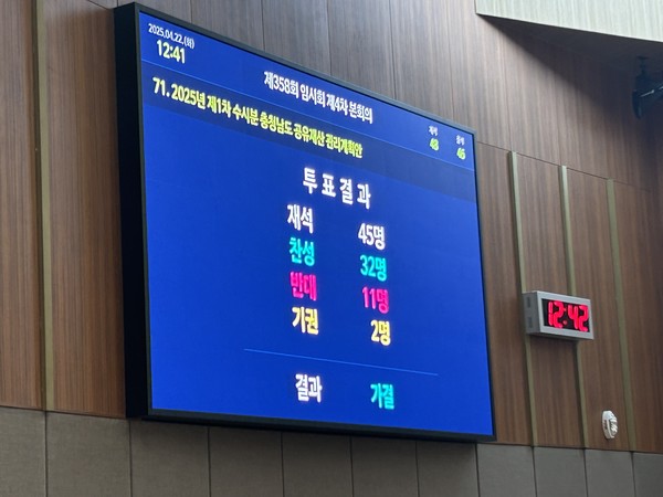 충남도의회는 22일 제358회 임시회 4차 본회의를 열고 이상근 의원(홍성1·국민의힘)이 대표 발의한 2025년 제1차 충남도 공유재산 관리계획안 부의의 건을 표결에 부쳤다.