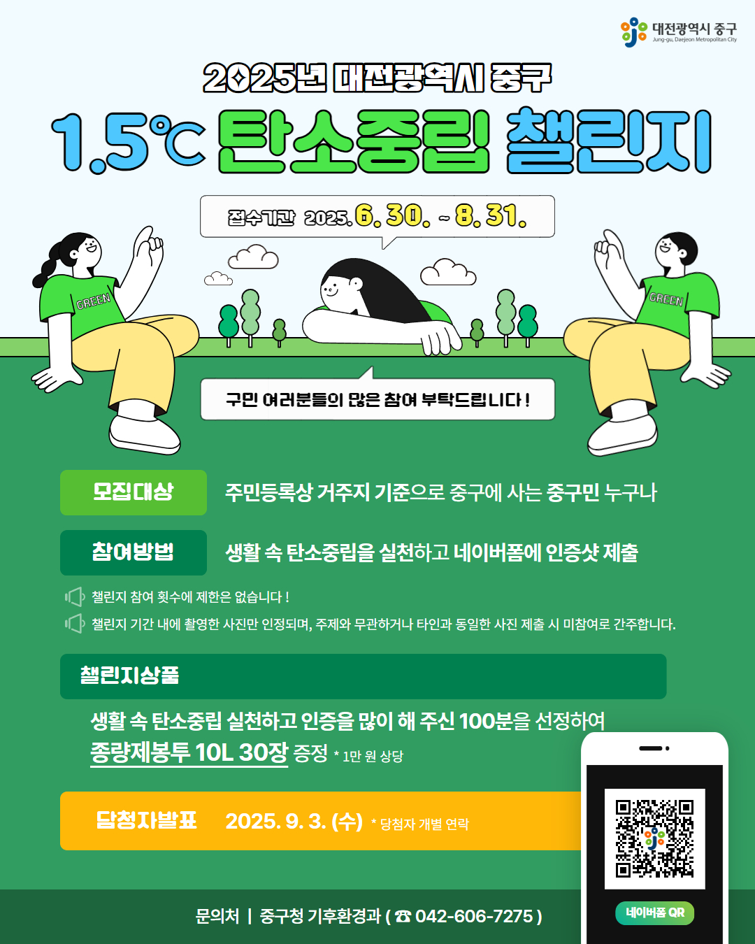 [충남일보 이연지 기자] 대전 중구는 오는 30일부터 '1.5℃ 탄소중립 챌린지'를 실시한다.