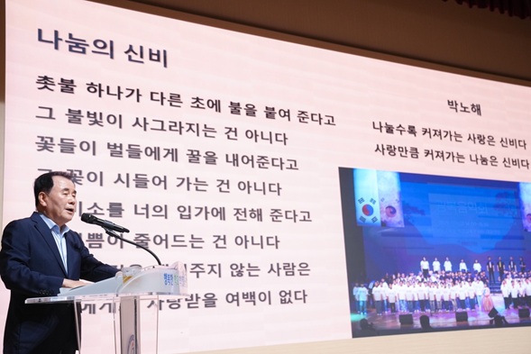 ▲ 김지철 충남교육감은 충남교육청 대강당에서 열린 9월 월례회에서 박노해 시인의 시 ‘나눔의 신비’를 소개하고 성찰과 사유의 중요성을 강조해 눈길.