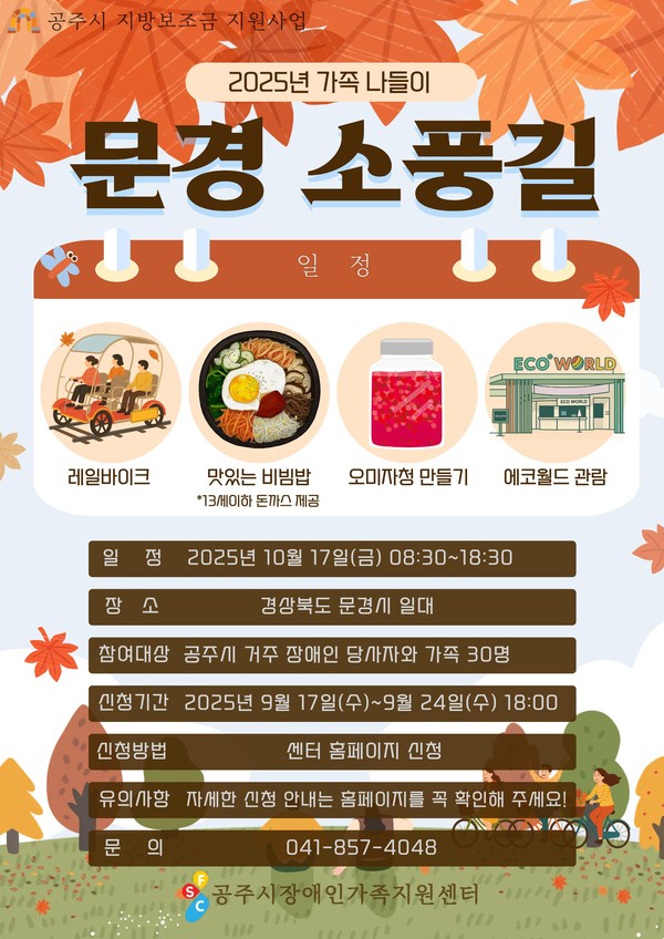 [충남일보 길상훈 기자] 충남 공주시장애인가족지원센터는 오는 10월 17일 공주시에 거주하는 장애인 가족을 대상으로 가족 나들이 프로그램 ‘문경 소풍길’ 참여자를 모집한다고 밝혔다.