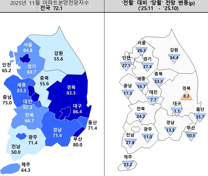 주택산업연구원(이하, 주산연)에 따르면 11월 아파트 분양전망지수는 전국 평균 19.4p 하락한 72.1로 나타났다. 수도권은 26.9p (100.2→73.3) 하락 전망됐으며, 비수도권은 17.7p(89.6→71.9) 하락 전망됐다. 수도권에서는 서울(111.1→84.8, 26.3p↓), 경기(97.1→69.7, 27.4p↓), 인천(92.3→65.2, 27.1p↓) 모두 큰 폭으로 하락 전망됐다.