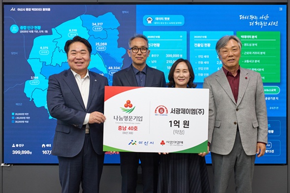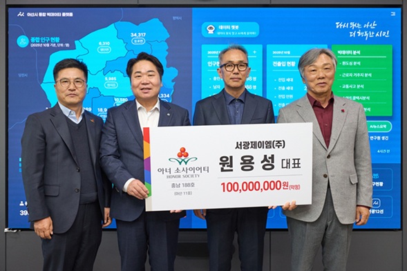 이날 행사에는 성우종 충남사회복지공동모금회장, 오세현 아산시장, 서광제이엠 원용성 대표와 배우자 한승은 씨, 화경종합건설 강준구 대표(충남 아너클럽 대표) 등이 참석했다.