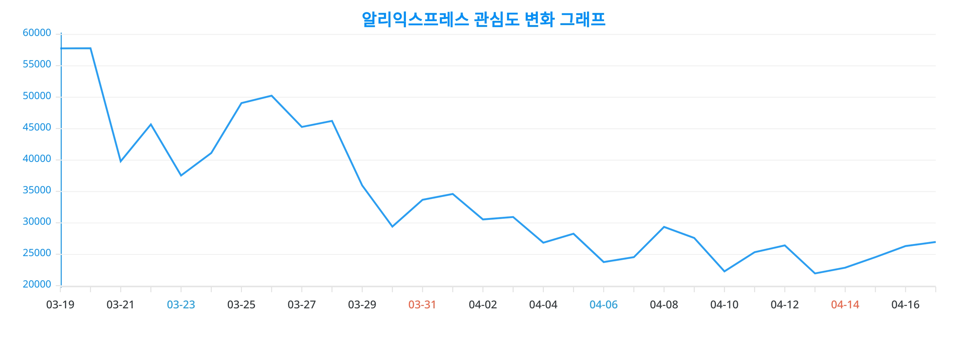 이번 분석을 통해 얻어진 알리익스프레스에 대한 일간 변화 추이 차트는, 알리익스프레스에 대한 관심이 어떻게 변화했는지를 생생하게 드러낸다.