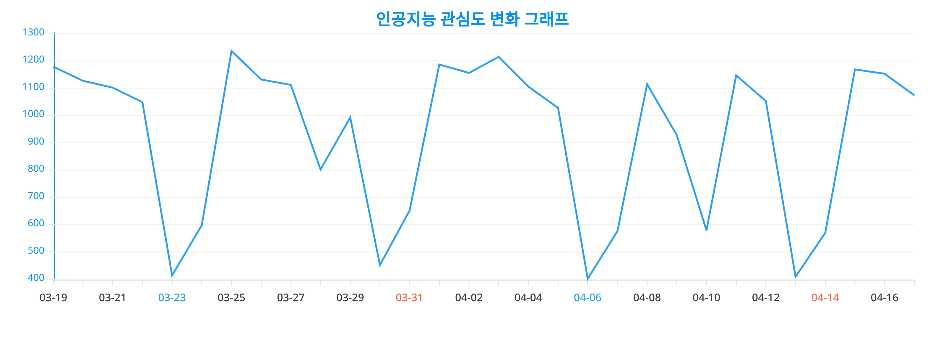 이번 분석을 통해 얻어진 인공지능에 대한 일간 변화 추이 차트는, 인공지능에 대한 관심이 어떻게 변화했는지를 생생하게 드러낸다.