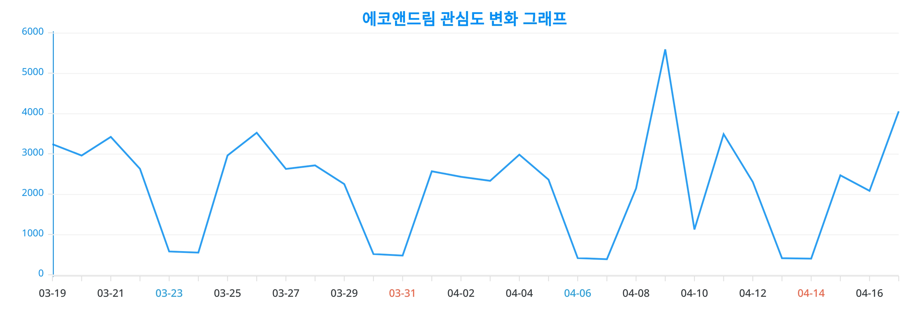 이번 분석을 통해 얻어진 에코앤드림에 대한 일간 변화 추이 차트는, 에코앤드림에 대한 관심이 어떻게 변화했는지를 생생하게 드러낸다.