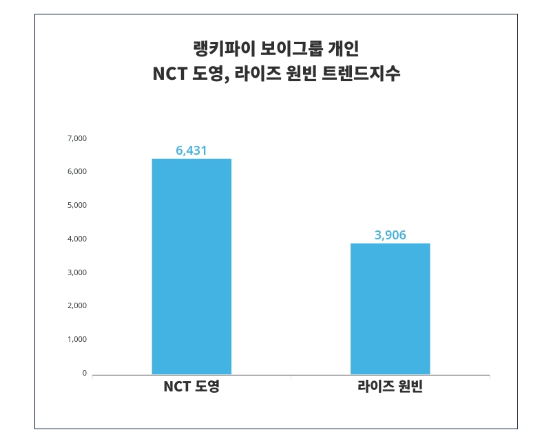 보이그룹 개인 트렌드 지수에서 NCT 도영은 '6431포인트'로 라이즈 원빈의 '3906포인트'보다 '2525포인트' 차이로 앞서는 것으로 나타났다.