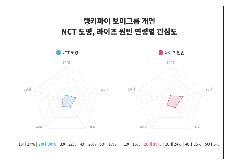 선두자리에 있는 NCT 도영이 '20대'에서 '30%'로 가장 높은 관심을 보이는 것으로 나타났으며 10대 17%, 20대 30%, 30대 22%, 40대 20%, 50대 10%로 각각의 연령대에서 얼만큼 관심을 받는지 알 수 있다. 또한 뒤를 잇는 라이즈 원빈이 '20대'에서 '39%'로 가장 많은 지지를 받는 것으로 밝혀졌고, 10대 16%, 20대 39%, 30대 24%, 40대 15%, 50대 5%로 다양한 연령대의 관심을 확인 할 수 있다.