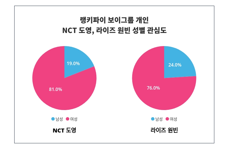 성별 관심도 부문에서 NCT 도영의 성별 관심도와 라이즈 원빈'의 성별 관심도는 위와 같이 나타났다.