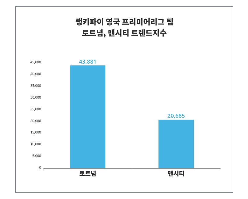 영국 프리미어리그 팀 트렌드 지수에서 토트넘은 '4만3881포인트'로 맨시티의 '2만685포인트'보다 '2만3196포인트' 차이로 앞서는 것으로 나타났다.