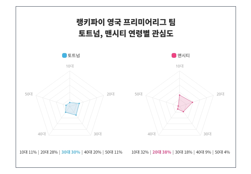 선두자리에 있는 토트넘이 '30대'에서 '30%'로 가장 높은 관심을 보이는 것으로 나타났으며 10대 11%, 20대 28%, 30대 30%, 40대 20%, 50대 11%로 각각의 연령대에서 얼만큼 관심을 받는지 알 수 있다. 또한 뒤를 잇는 맨시티가 '20대'에서 '38%'로 가장 많은 지지를 받는 것으로 밝혀졌고, 10대 32%, 20대 38%, 30대 18%, 40대 9%, 50대 4%로 다양한 연령대의 관심을 확인 할 수 있다.