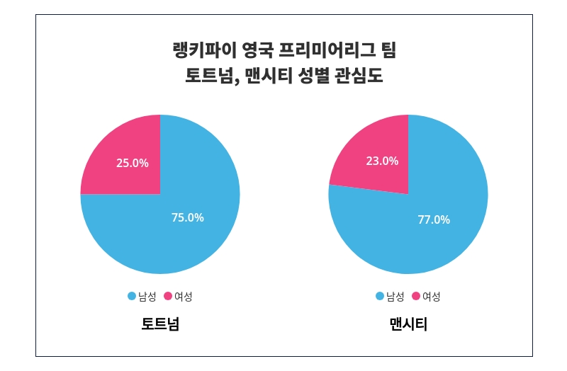 성별 관심도 분석 결과, 토트넘은 '남성'에게 '75%'로 지지를 받았으며, 토트넘은 여성보다 '남성'에게 더 많은 관심을 받고 있었다. 그 뒤를 이어 맨시티는 '남성'에게 '75%' 지지를 받았으며, 맨시티는 여성보다 '남성'에게 더 많은 관심을 받고 있음이 드러났다.