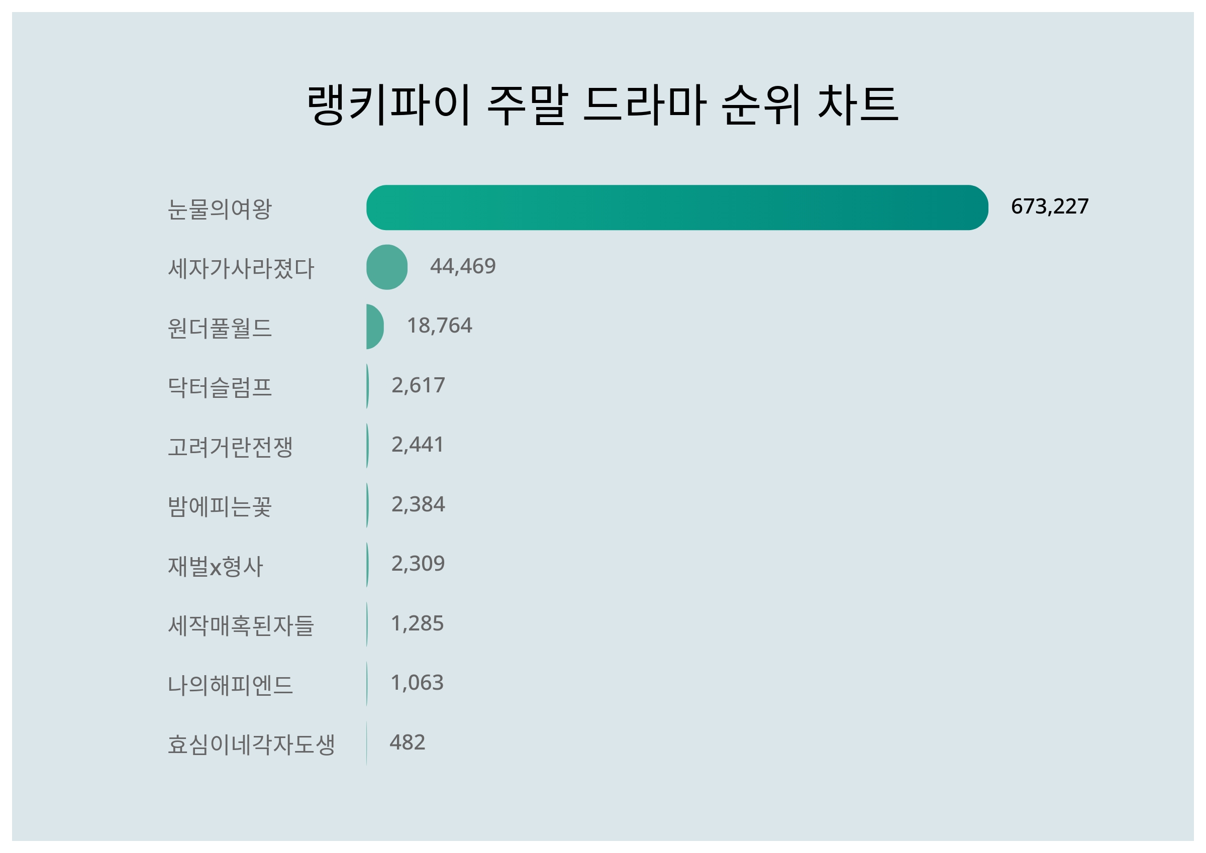 | 1 | 눈물의여왕 | 673,227 | 650,982 | 22,245 | 3.4% |