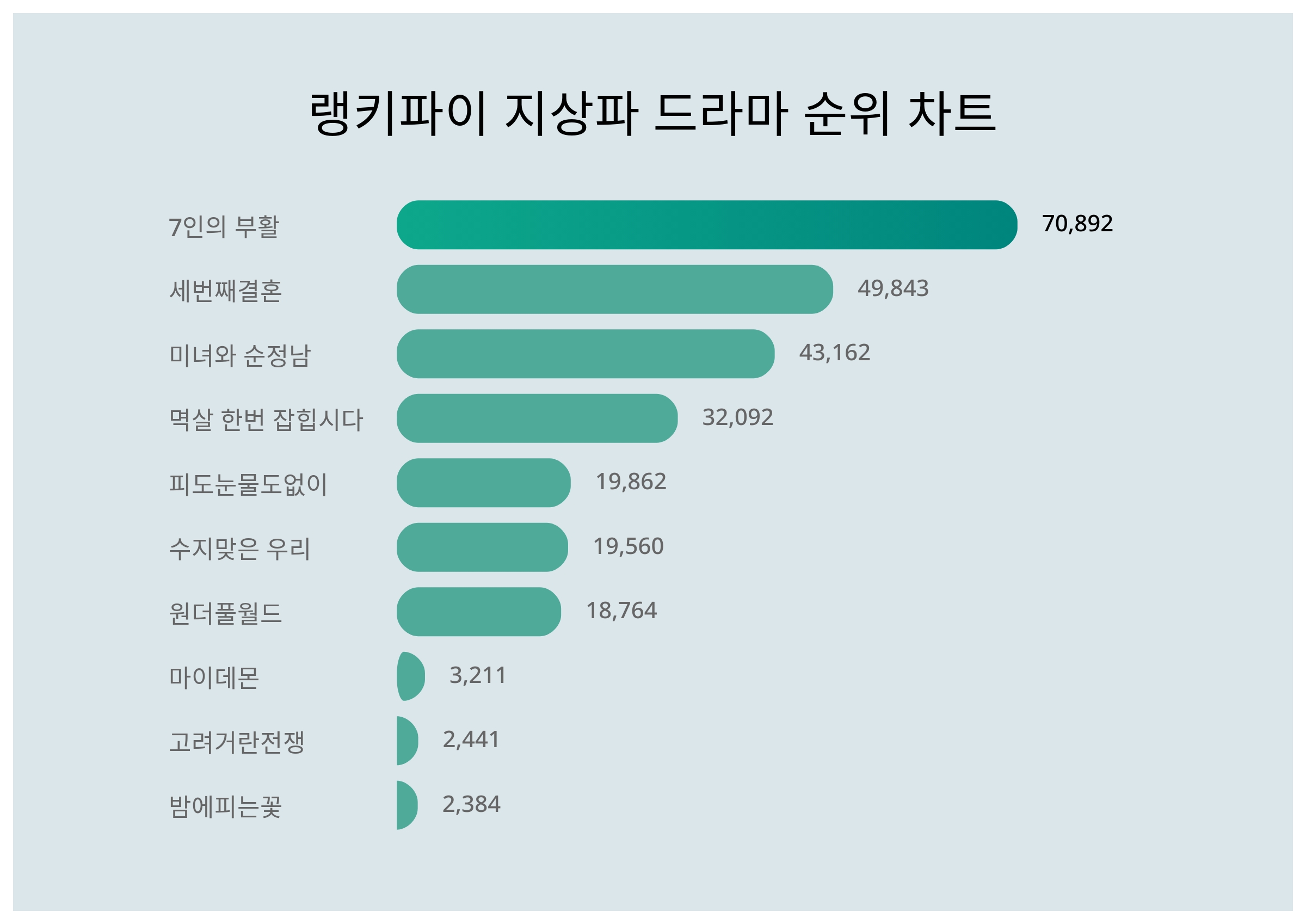 지상파 드라마 트렌드 지수는 전주 키워드 검색량과 구글트렌드 점수를 랭키파이가 자체적으로 합산해 산출한 지표이다.