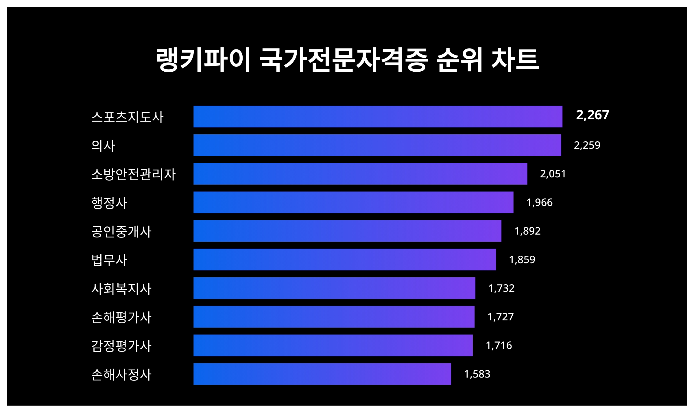 | 1 | 스포츠지도사 | 2,267 | 463 | 1,804 | 389.6% |