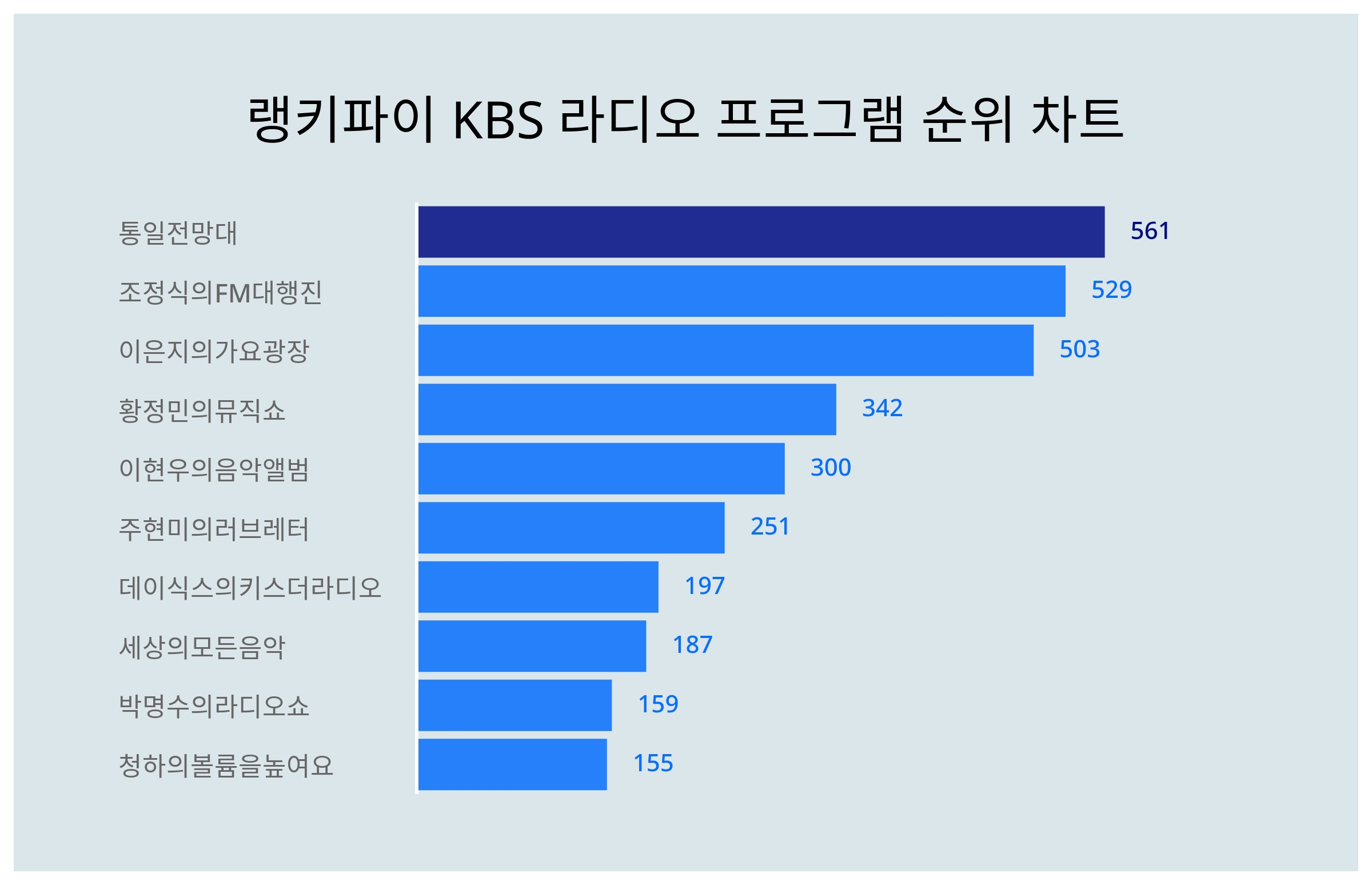 빅데이터 분석 프로그램을 보유한 랭키파이는 전주 키워드 검색량과 구글 트렌드점수를 합산해 KBS 라디오 프로그램 트렌드지수를 공개했다.