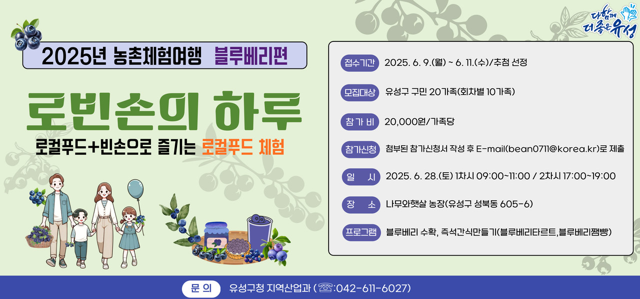 [충남일보 이연지 기자] 대전 유성구는 오는 11일까지 가족 단위로 함께 즐기는 로컬푸드 농촌 체험 여행 '로빈손의 하루' 참여자를 모집한다.